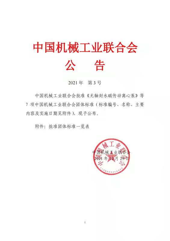 由甘肅省科學(xué)院磁性器件研究所牽頭編制的《無軸封永磁傳動(dòng)離心泵》標(biāo)準(zhǔn)T/CMIF 149-2021 公布實(shí)施