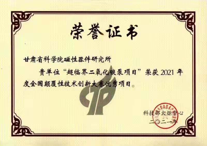 祝賀我單位榮獲 “超臨界二氧化碳泵項(xiàng)目 ” 2021年度全國(guó)顛覆性技術(shù)創(chuàng)新大賽優(yōu)秀項(xiàng)目